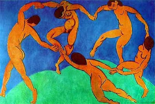 Para Matisse, as figuras interessam como formas que constituem uma composição. Observe nesse quadro como as figuras humanas, o céu ao fundo e a terra formam um todo. Veja o emprego simples, mas intenso, das cores: o azul forte do céu, o verde da terra e o vermelho dos corpos. Note ainda a impressão de movimento que temos ao olhar as figuras que dançam entre o céu e a terra. Repare nos pés e nos braços das figuras: cada uma delas parece continuar o movimento iniciado pela outra, como numa roda que gira sem interrupção.